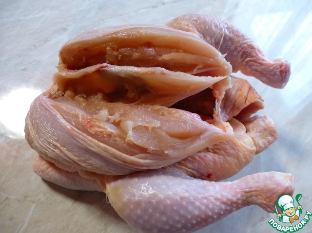 Курицу хорошо промыть, сделать два продольных надреза вдоль грудки, и постепенно руками снять с нее мясо.