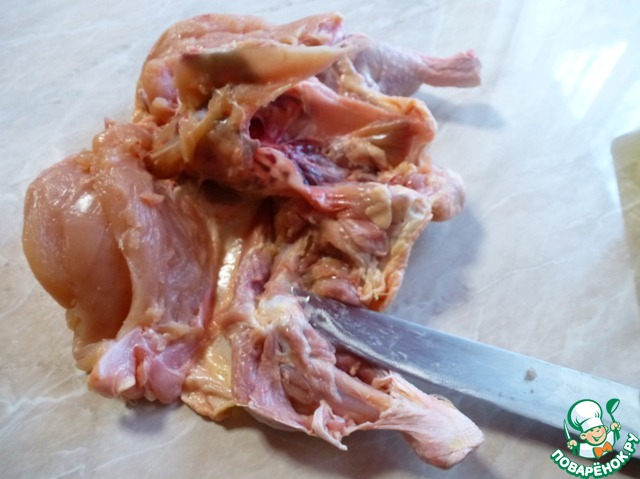 На ножках сделать разрезы, как показано у меня на фотографии и удалить кости. Тоже самое проделать с крыльями. Потом осторожно снять весь скелет с курицы. Не бойтесь, это не займет много времени, у меня ушло минут 8 с отвлечением на пошаговые фотографии.