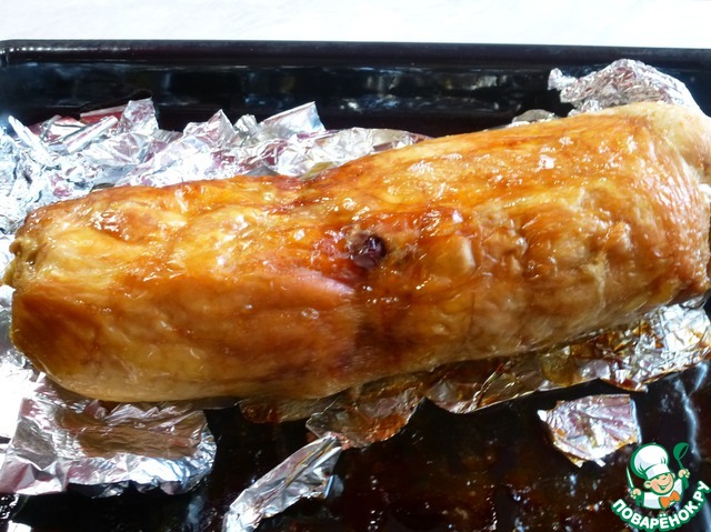 | Внимание, готовить абсолютно не сложно! Вкус превосходный, гарантирую, кто попробует такой рулет, обязательно попросит рецепт! Благодаря соевому соусу корочка у рулета золотая и очень вкусная. Обязательно приготовьте на праздничный стол, и Вы не пожалеете!!! Плюс к рецепту данного рулета в качестве бонуса прилагаю рецепт вкуснейшего соуса из апельсина из дижонской горчицы. |