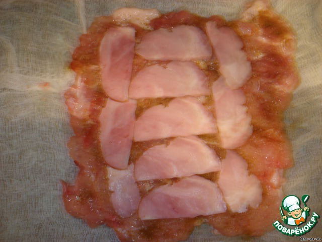 Нарезаем ветчину пластинками и выкладываем на курицу. Ветчину можно брать любую, можно также выкладывать яичные блинчики, морковь, зелёный горошек.