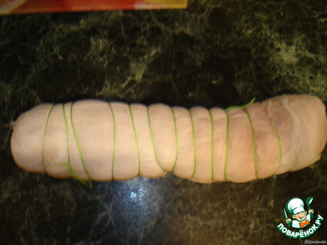 Аккуратно свернуть рулет, связать нитками и варить в бульоне около 1 часа.