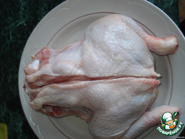 Курочку моем, отрезаем крылышки и делаем продольный надрез по позвоночнику.