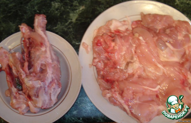 Аккуратно, стараясь не повредить кожу, отделяем по кругу мясо от костей. Если курица крупная толстые места мякоти можно слегка отбить. Косточки используем для приготовления бульона. Добавляем в него луковицу, корень петрушки, лавровый лист, другие пряности.