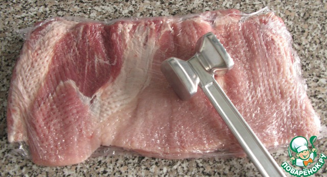 3. Мясо обернуть в пищевую пленку и хорошо отбить с обеих сторон.