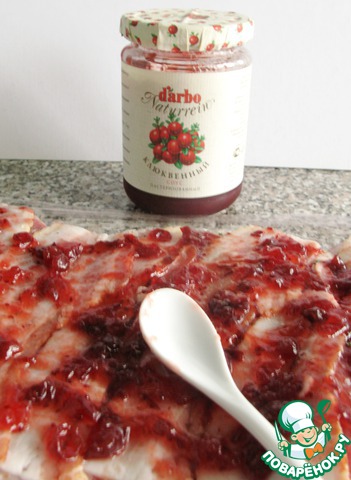 6. На бекон выложить клюквенный соус (я использовала соус 'Клюквенный' ТМ "D’arbo") и равномерно распределить его с помощью ложечки.
