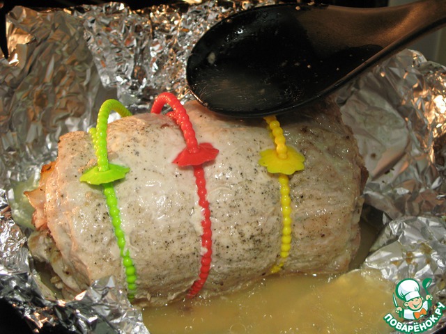 9. Запекать рулет в фольге в течение 55-60 минут, затем раскрыть фольгу и запекать еще 35-40 минут, периодически поливая его вытопившимся соком.