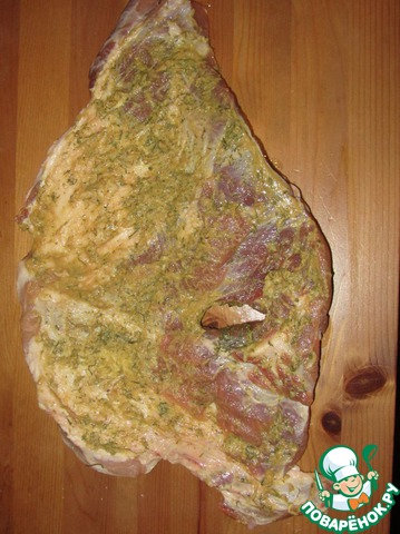 Пласт свиной тушу или балыка натираем солью, чесноком и горчицей сверху присыпаем укропом.