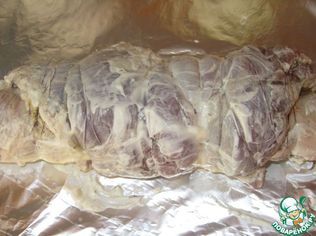 После этого сворачиваем плотно мясо в рулет и обвязываем ниткой или скрепляем зубочистками. Обмазываем майонезом и заворачиваем в фольгу.