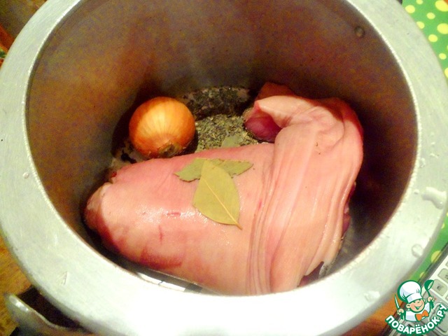 Рульку замочить на ночь в воде, промыть, отскрести кожу. Положить в скороварку лук, базилик, гвоздику, рульку и залить водой, чтобы рулька ей была закрыта. Посолить покруче и варить после закипания в скороварке 1,5-2 часа.