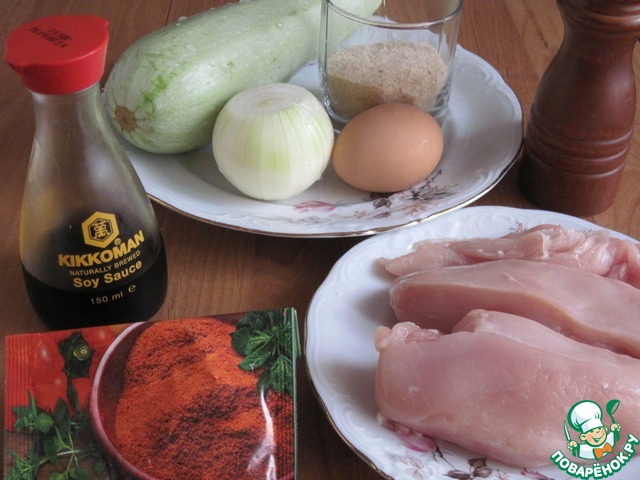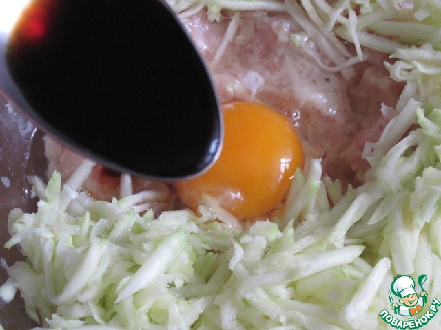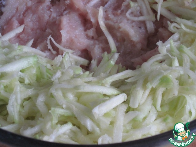 Куриное мясо пропустим через мясорубку вместе с луком. Очищенный кабачок натрем на крупной терке, смешаем с куриным фаршем.