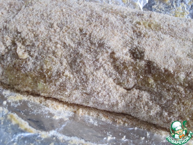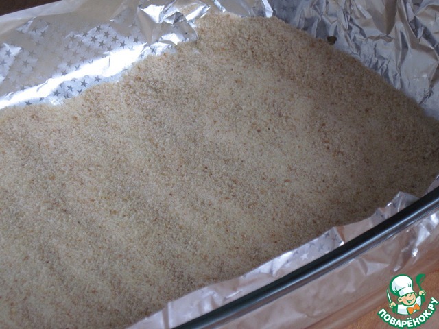 На фольгу насыпим слой панировочных сухарей.