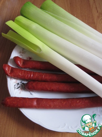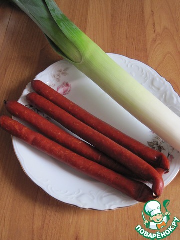 Для начинки приготовим лук порей и колбаски охотничьи.