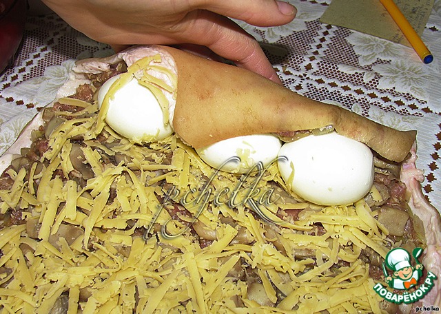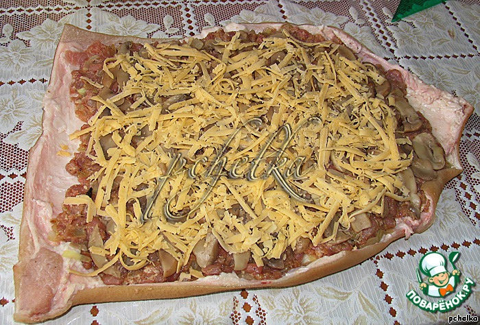 на шкуру выложить фарш, оставив немного пустым место с двух краёв, потому что при заворачивании рулета фарш немного будет сдвигаться;