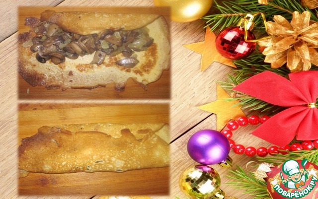 В блинчик заворачиваем грибы перемешанные с луком. Грибной фарш смешайте с сырым яйцом, чтобы при нарезке рулета грибы не рассыпались.