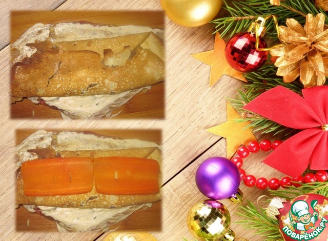 Укладываем блинчик на филе. Сверху - пластинки моркови (в разрезе виден только один слой моркови, второй забыла положить).
