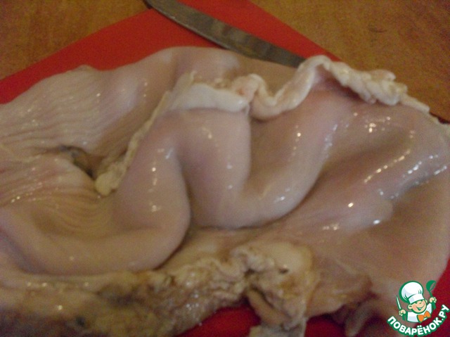 На внутрисемейном совещании было решено его не сшивать в один, а сделать две части. Моем его по Жванецкому: тщательнЕй, тщательнЕй! До прозрачной воды и замерзания рук. Потом замачиваем на ночь. Потом опять моем и срезаем пленку внутри: аккуратно, чтоб оболочку внутреннюю не повредить, не дай Бог…Она тут важнее внешней, ибо начинку держать будет. Пока отставляем в сторону, занимаемся начинкой.
