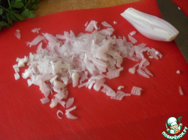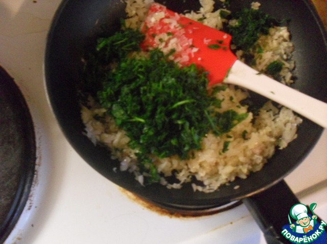 Пассeруем в 1 ст. ложке сливочного масла 5 минут. Петрушку пробить в блендере (убейте, не знаю, почему не порезать) и добавить к луковым, пассeруем еще 2 минуты. Отставляем в сторону – остывать.