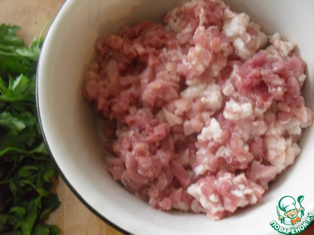 Мясо режем на кубики, как на манты (0,5 см примерно). На фото видно, что тут и грудинка, и постное мясо.