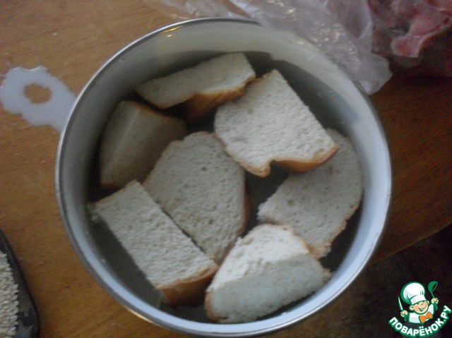 То мясо, что на фарш, прокручиваем в мясорубке, понятно. Я в ту же мясорубку кинула отжатый хлеб для более равномерного размалывания и распределения.