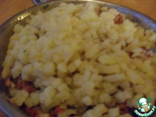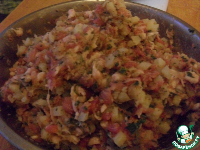 Мое соображение: чтоб зазря не мять картошку, сперва смешиваем все остальное, солим. Приправляем...
