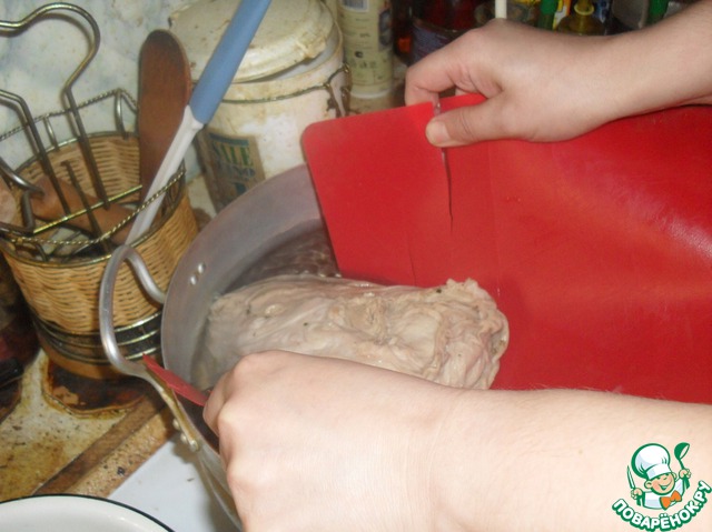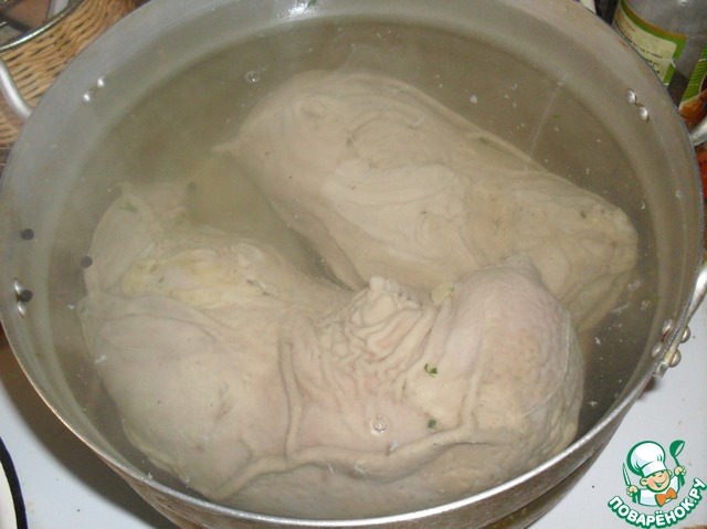 Пока мы тут портняжничали, на плите закипала вода. В источниках ничего не сказано, но я посолила по привычке. Закипела, убавили огонь, ибо вода НИ В КОЕМ случае не должна кипеть!!! Угрожают разрывом оболочки и вываливанием фарша в воду, а оно нам надо? По совету Инны, я на гибкую доску положила свой волшебный мешочек, опустила доску в воду и позволила желудку аккуратно соскользнуть.