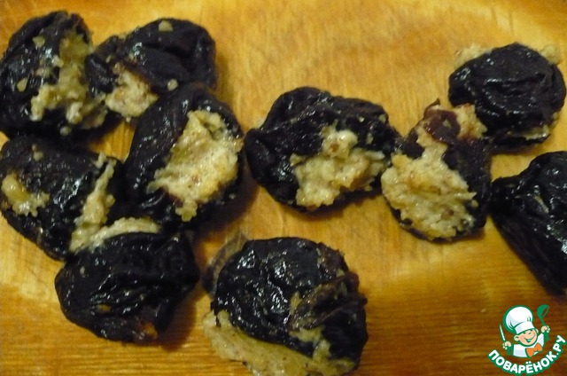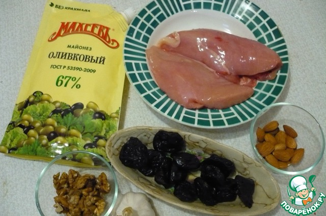 Миндаль и грецкие орехи измельчить в некрупную крошку. Добавить измельченный чеснок и 2 ст. л. майонеза. Чернослив промыть и залить кипятком до мягкости.