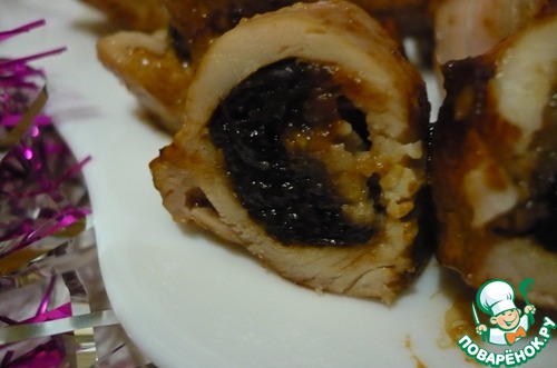 Филе нарезать на небольшими кусочки, сделать прорезы в середине, делая сквозную дырку. Посолить и вставить нафаршированный чернослив вовнутрь. Если он большой, то разрежьте чернослив пополам вдоль. Обжарьте рулетики на горячем масле с 2 сторон.