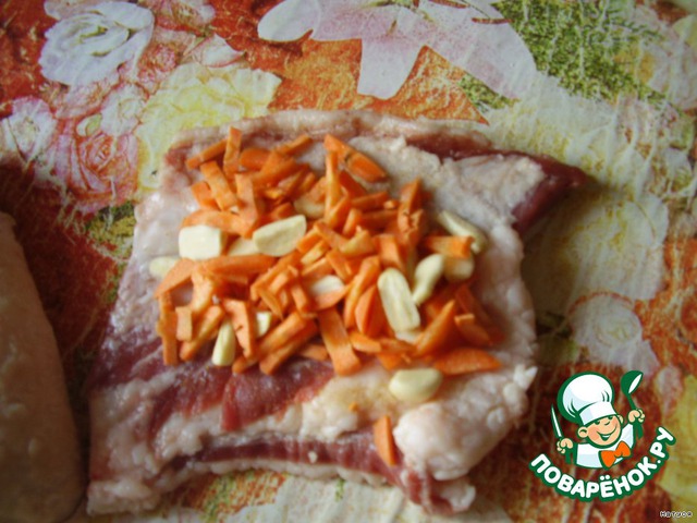 Очищенную морковь и чеснок нарезаем, выкладываем на кусок пузовины, на сторону где мясная прослойка. Солим, добавляем специи.