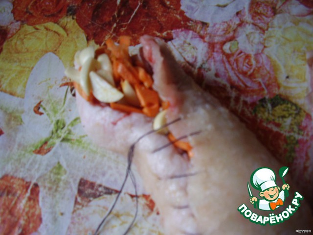 Зашиваем нитками. Обсыпаем рулет сверху теми же специями и солью. Жарим в духовке при темп. 180 гр. 1,5 часа.