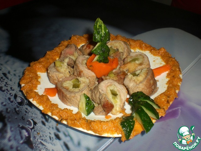 | Рулетики из свинины с драником и соленым огурчиком внутри под огуречной елочкой - подарочки к новогоднему столу |