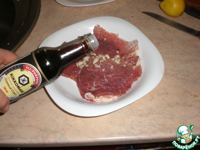 Свинину нарезать, отбить, замариновать в соевом соусе Kikkoman и лимонном соке