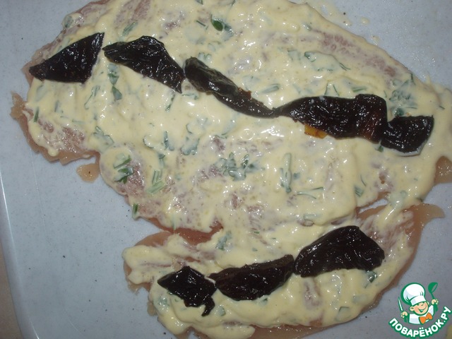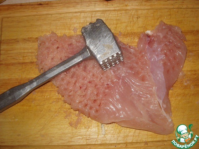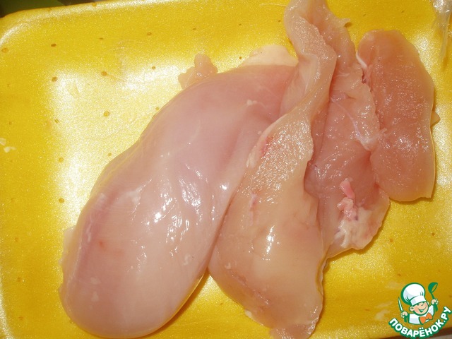Куриную грудку промыть и разделить на несколько частей, прорезая "книжечкой".