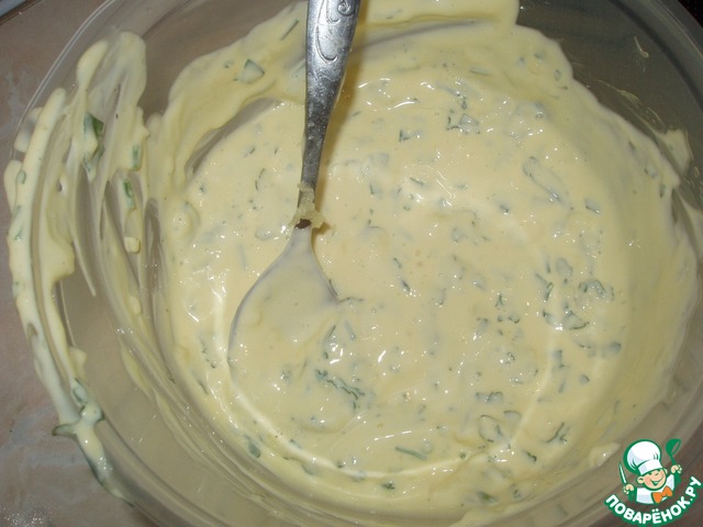 Майонез смешать с измельчённым чесноком и зеленью. Количество чесночка можете регулировать сами.