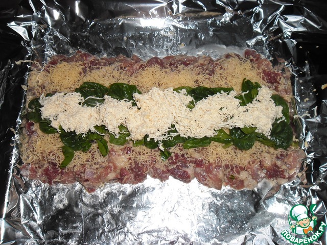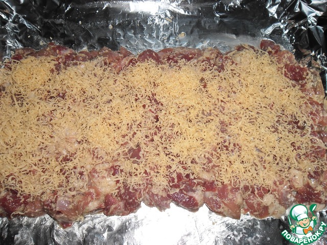 Посыпать фарш тертым голландским (или любым другим твердым) сыром.