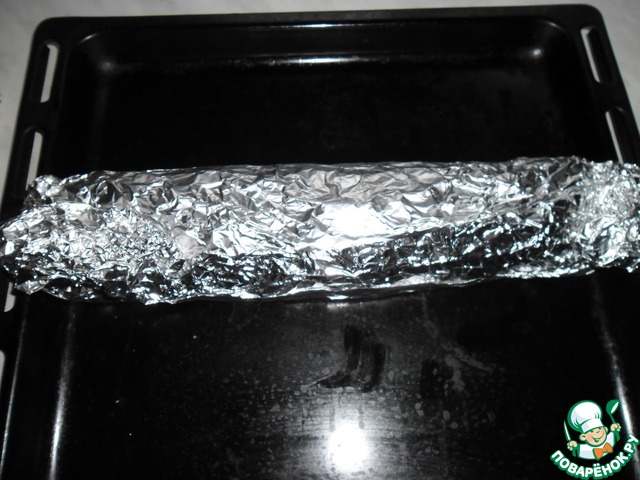 Осторожно, поднимая за края фольги, сформировать рулет, одновременно заворачивая его в фольгу как можно плотнее.