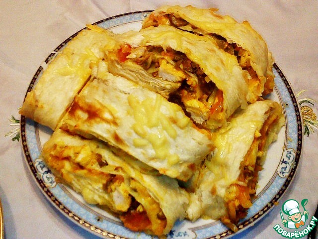 далее берем протвень, смазываем маслом, кладем лаваш на всю поверхность, смазываем всю поверхность половиной соуса, выкладываем полоской овощную начинку, сверху курочку, грибы, сыр (тертый), накрываем лавашом и повторяем, смазываем оставшимся соусом, томаты, курочка, грибы, сыр - далее аккуратно берем с одного конца и сворачиваем в толстую колбаску, сверху можно также посыпать сырком, зеленью - отправляем в духовку на 15-20 минут при 160, далее разрезаем на порционные кусочки, рулетик получается очень сочным, нежным и остреньким, приятного аппетита!