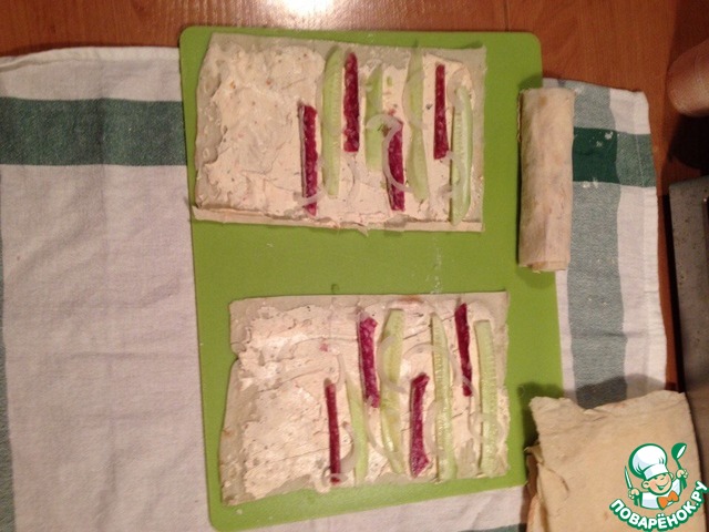 Лаваш нарезаем на прямоугольники, кладём на доску, намазываем тонким слоем сыра (у меня оказался с томатами) по всей поверхности. Выкладываем в шахматном порядке колбаску, чередуя её огурцом. Посыпать луком.