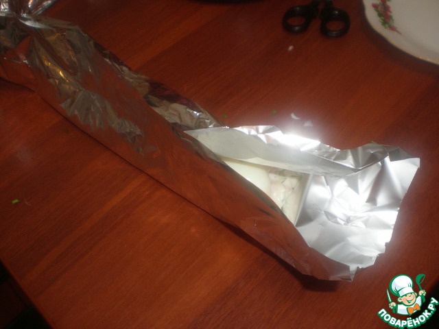 На фольгу выкладываем сырное желе прямоугольничком. И укладываем по центру яйца.