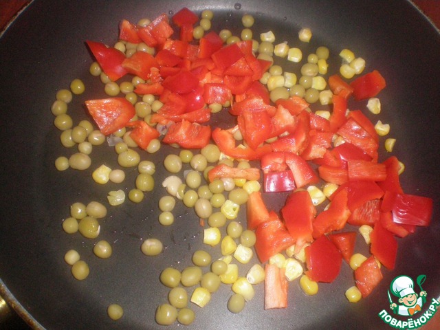 Замороженную кукурузу (можно ее взять пополам с зеленым горошком) быстро обжариваем с порезанным кубиками красным перцем.