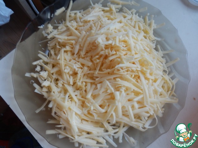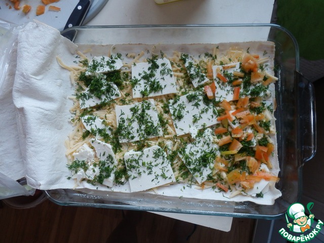 Выкладываем часть тертого сыра (здесь нужно посчитать сколько получится слоев лаваша на форму и разделить сыр на порции) и часть сыра Фета (я нарезаю сразу в форму тонкими пластинками).
