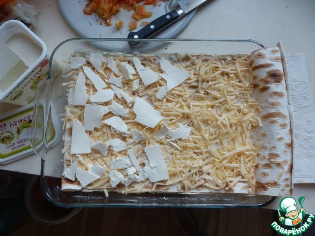 Так повторяем со всеми слоями лаваша, последним закрываем весь рулет и подворачиваем края вниз (можно тупой стороной ножа). Сверху выливаем оставшуюсь заливку и ставим в духовку на 15-20 минут при температуре 180°. Чтобы подрумянить верх, можно поставить еще на 3 минуты под верхний гриль.