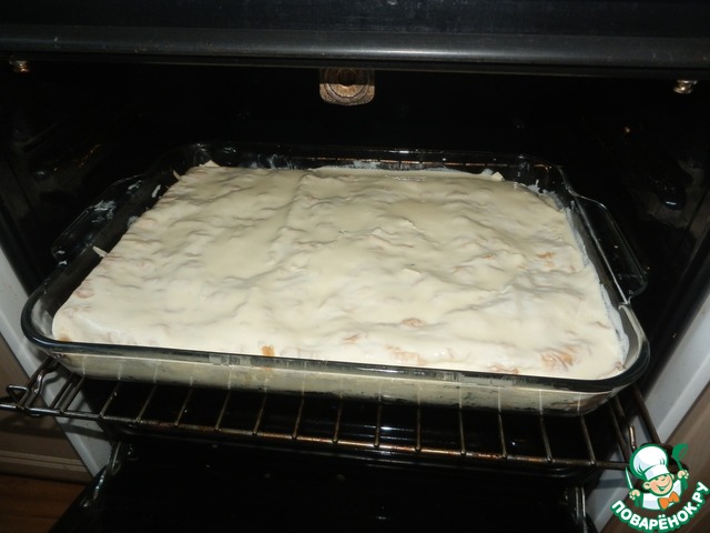 Смазываем форму и выкладываем первый слой лаваша (его можно порезать по размеру формы или использовать одним листом).