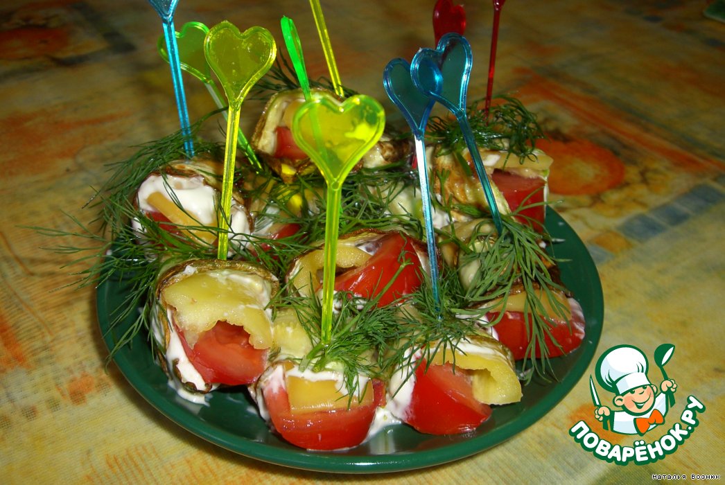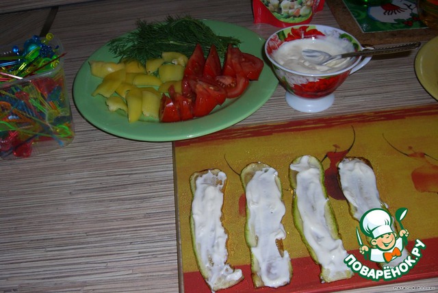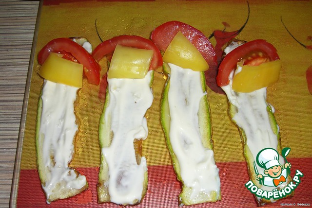 Пожаренные кабачки смазываем чесночным майонезом, на край выкладываем по кусочку помидорки и перчика желтенького.