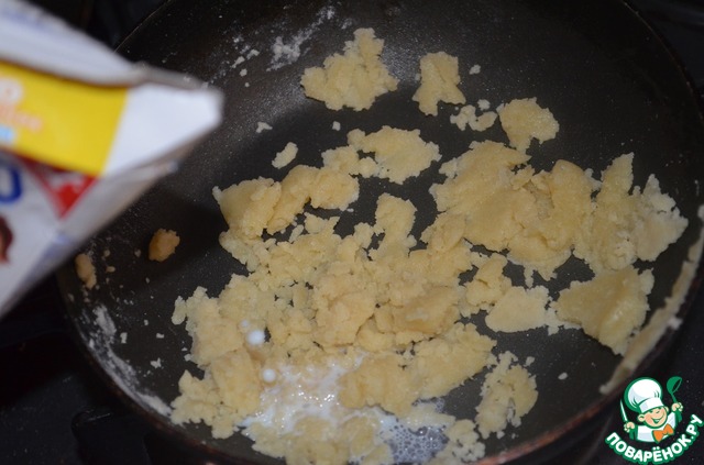 На сковороде растопить сливочное масло, в нем поджарить слегка муку. Прогреть минуты две-три.