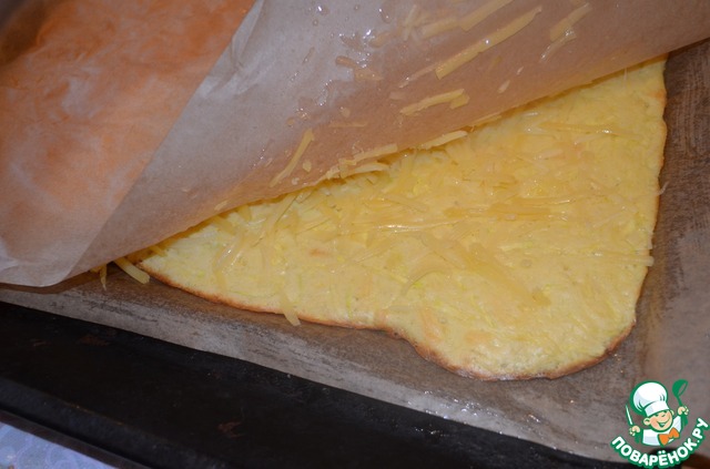 Переверните так, чтобы бумага, на которой выпекался омлет, оказалась сверху. И аккуратно снимите бумагу. Если у Вас немного омлет прижарился к бумаге, положите на эту бумагу сверху мокрое полотенце минут на пять, а потом спокойно снимайте бумагу. Сыр у нас остается снизу.