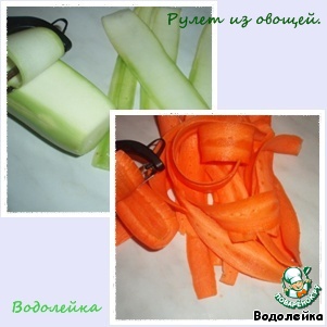 Теперь берем морковку и кабачок (ну их, естественно, помыть и почистить) и с помощью овощечистки (на фото видно) нарезаем овощи на тонкие полоски. Можно, конечно, и ножом, но так тонко вряд ли получится (ну и после нарезки ножом время приготовления увеличится, т.к. овощи будут нарезаны немного толще).