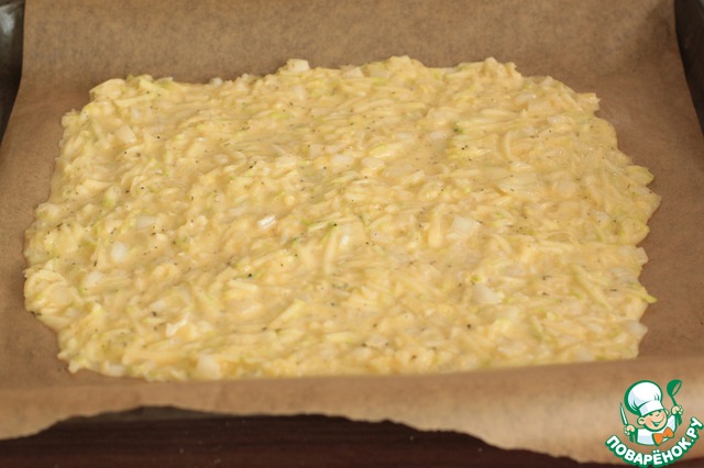 Разогреем духовку до 200 градусов, на бумагу для выпечки положим наше тесто и разровняем.