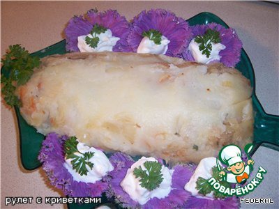Выложить на смоченное полотенце, разровнять, выложить начинку из креветок и закрутить рулетом с помощью полотенца.