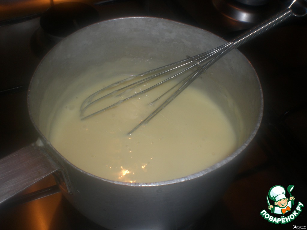 Не снимая с огня, небольшими порциями введём тёплое молоко. При этом постоянно помешиваем, чтобы масса была однородной.