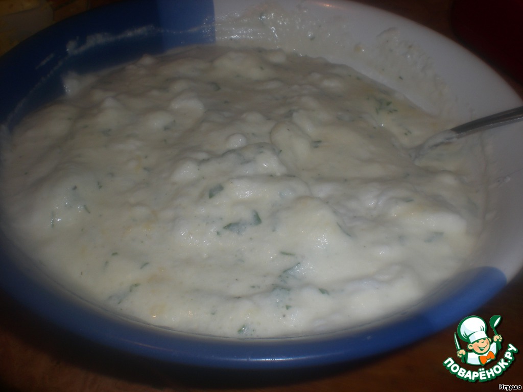 2/3 сыра и оставшуюся зелень вводим в наше тесто.